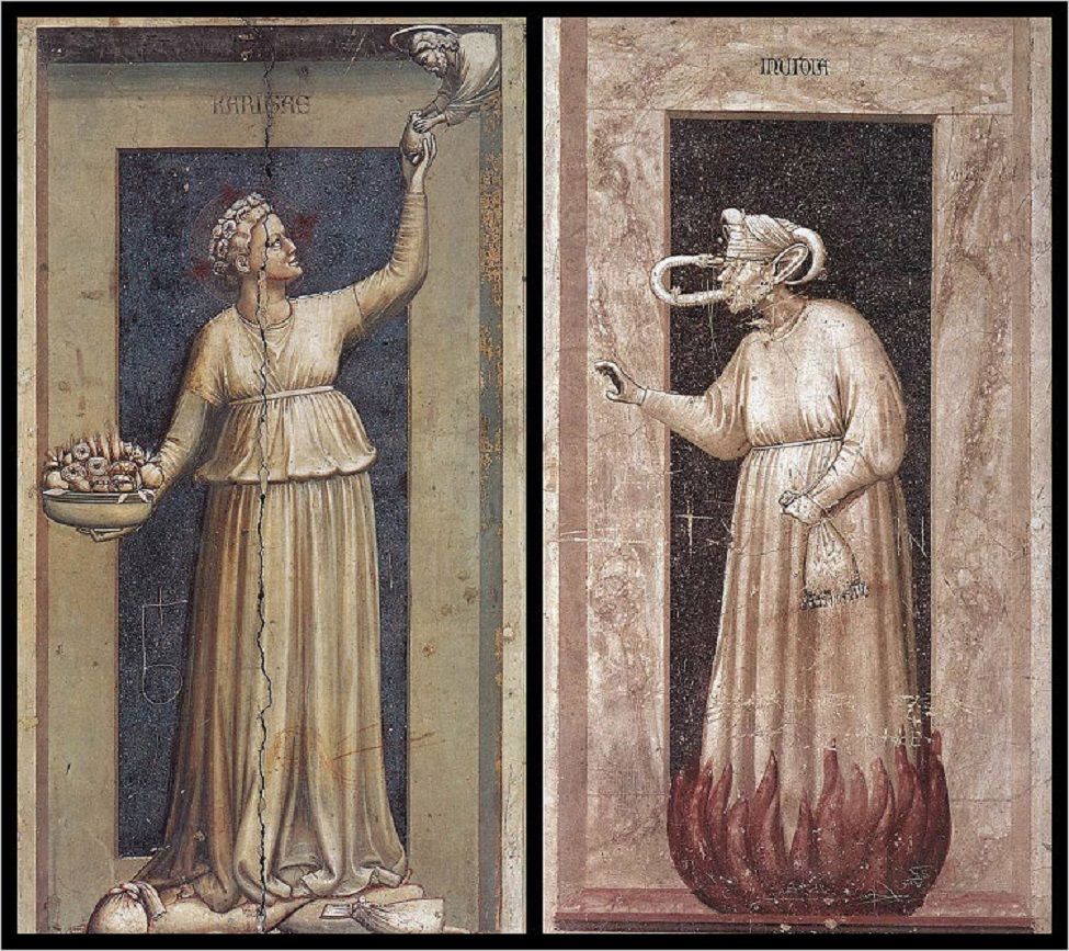 На фото: Милосердие — Зависть. Аллегории Добродетелей и Пороков. Джотто ди Бондоне, фрески капеллы дель Арена в Падуе, 1306 г.