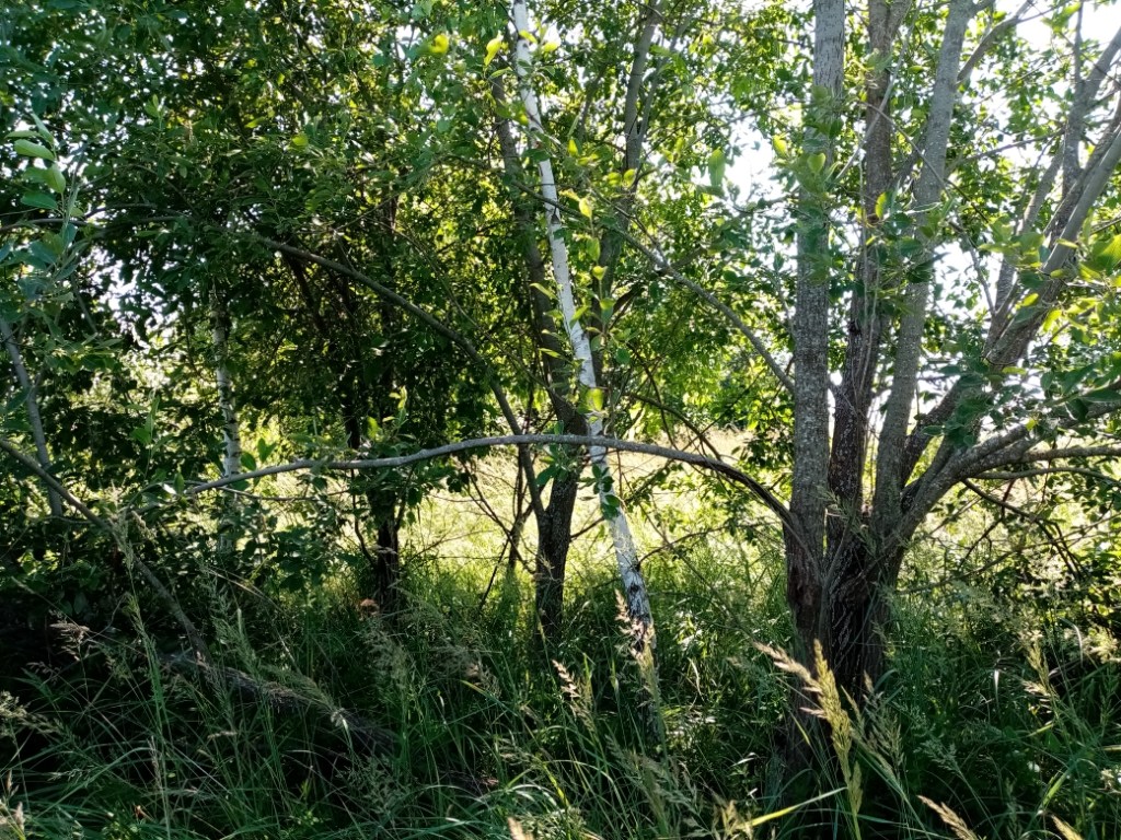 На небольшом отвоеванном кусочке моего леса я смогла разглядеть несколько широколистных ив и осин, а еще — две березки. Углубиться дальше не получилось, трава — по пояс. Но я уже была счастлива.