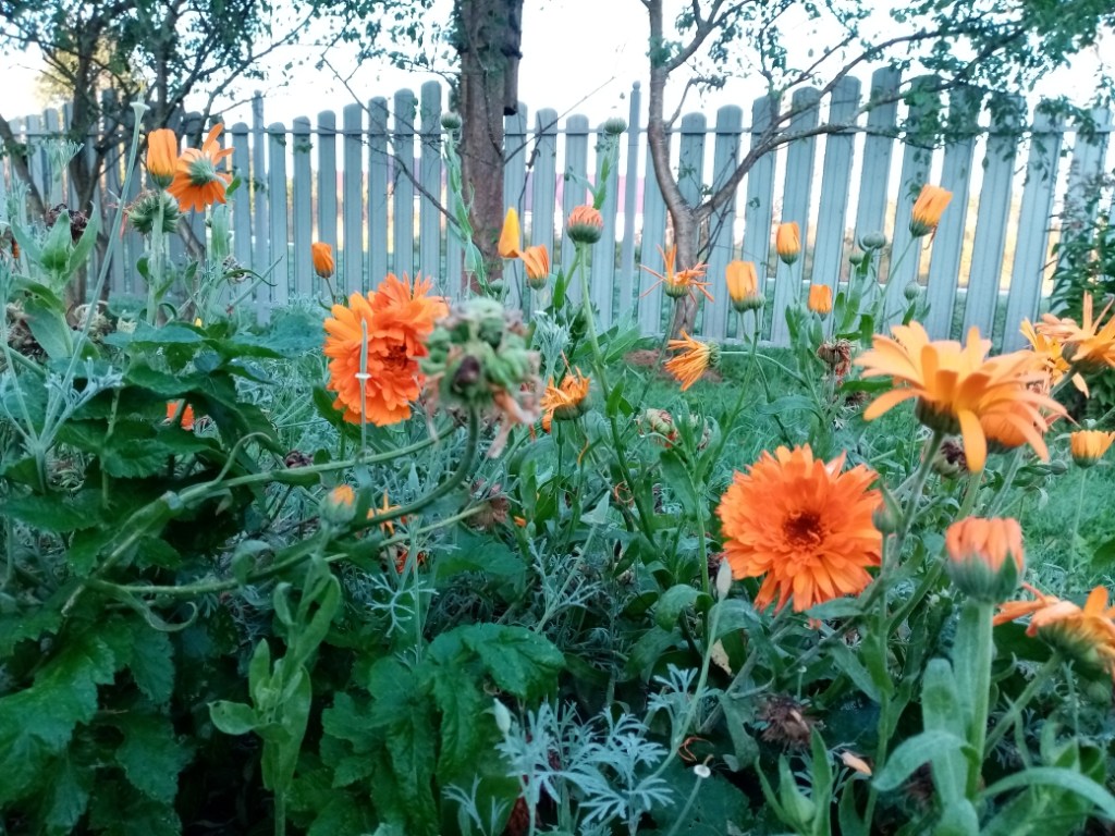 А я не хочу. Небо многообещающе голубое. Тончайший месяц балдеет в белоснежном коконе, оставленном самолетом. Солнце художественно расчертило лужайку длинными тенями. Календула вопреки холодам стала ярче и распушилась.